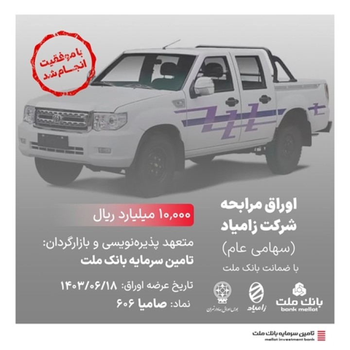 انتشار 10,000 میلیارد ریال اوراق صکوک مرابحه برای تامین مالی شرکت زامیاد روز یکشنبه ۱۸ شهریورماه با تعهد پذیره‌نویسی و بازارگردانی تامین سرمایه بانک ملت صورت گرفت و با موفقیت به پایان رسید.
