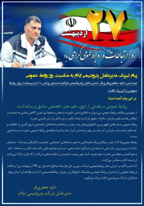 مهندس داود جعفری‌فر‌ی‌فر؛ مدیرعامل پتروشیمی ایلام با صدور پیامی ۲۷ اردیبهشت روز روابط عمومی را تبریک گفت.