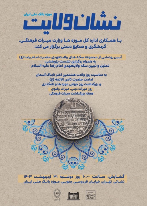 به گزارش روابط عمومی بانک ملی ایران، به مناسبت ولادت امام رضا (ع) و بزرگداشت روز جهانی موزه ها و نامگذاری آن روز با عنوان «میراث دینی، میراث رضوی»، طی مراسمی از مجموعه سکه های ولایتعهدی حضرت امام رضا(ع)، با همکاری ادارۀ کل موزه های وزارت میراث فرهنگی، گردشگری و صنایع دستی در محل موزۀ بانک ملی ایران رونمایی می شود.