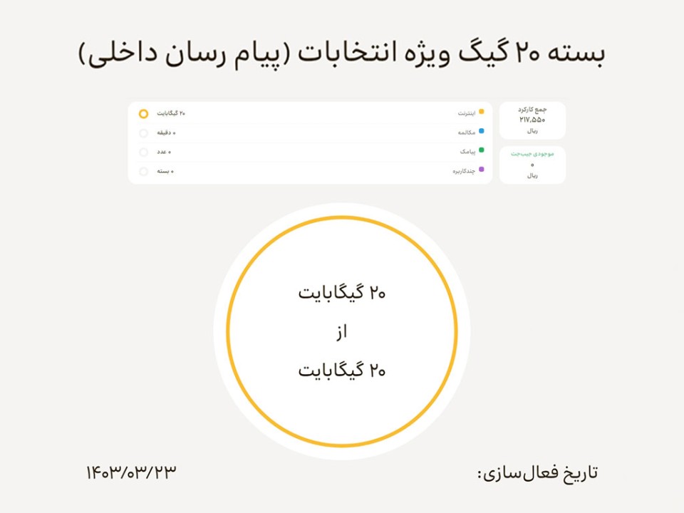 این بسته اینترنت رایگان با حجم 20 گیگابایت، به منظور استفاده مشترکان در ایام تبلیغات انتخابات ریاست جمهوری 1403 و برای استفاده در سکوهای منتخب داخلی اعلامی وزارت ارتباطات و فناوری اطلاعات، شامل اپلیکیشنهای لنز، ایتا، روبیکا، تلوبیون، ویراستی، سروش، گپ، آیگپ و بله در نظر گرفته شده است و با مدت یک ماه از شروع فعالسازی، قابل استفاده است.