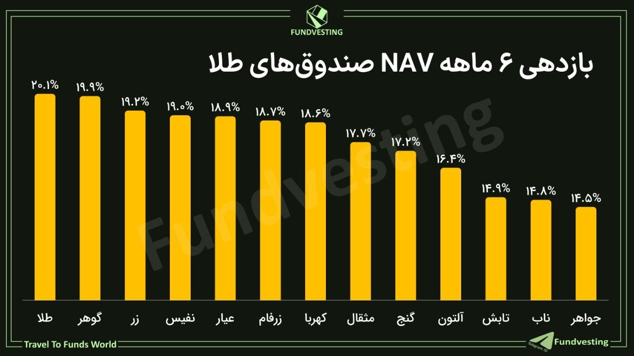نمودار فوق بازدهی 6 ماهه صندوقهای طلا را بر اساس NAV آنها مورد بررسی قرار داده است و همانطور که پیداست، صندوق پشتوانه طلای لوتوس با ثبت بازدهی بیش از 20 درصدی، رتبه اول را کسب کرده است.
