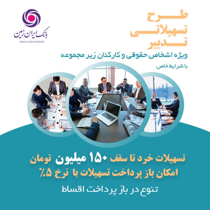 بانک ایران زمین به منظور افزایش رضایت مندی مشتریان و تکمیل سبد محصولات و خدمات خود، اقدام به اعطای تسهیلات به اشخاص حقوقی و کارکنان زیر مجموعه با نام طرح تسهیلات تدبیر کرده است.