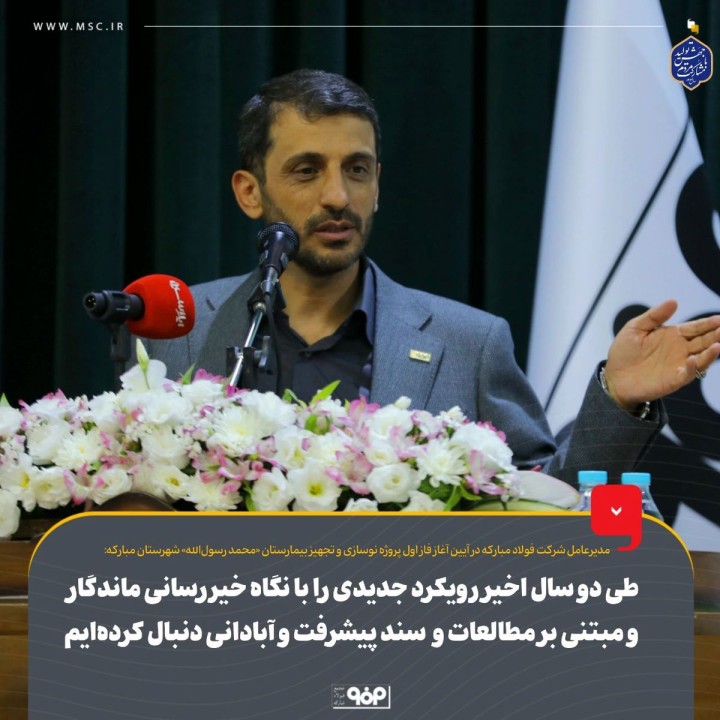 محمدیاسر طیب‌نیا، مدیرعامل شرکت فولاد مبارکه در آیین آغاز فاز اول پروژه نوسازی و تجهیز بیمارستان «محمد رسول‌الله» شهرستان مبارکه گفت: واقعیت این است که رسالت و ماموریت اصلی ما بسیار بالاتر و در حقیقت رسالت «خیررسانی» است، بنابراین اگر ما در مسیر خیررسانی به مردم حرکت کنیم، خود به خود مابقی اهداف و رسالت های خود را نیز دنبال کرده‌ایم؛