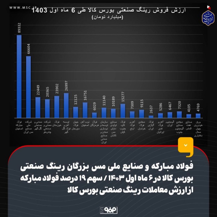 [فولاد مبارکه و صنایع ملی مس بزرگان رینگ صنعتی بورس کالا در 6 ماه اول 1403 / سهم 19 درصد فولاد مبارکه از ارزش معاملات رینگ صنعتی بورس کالا]
