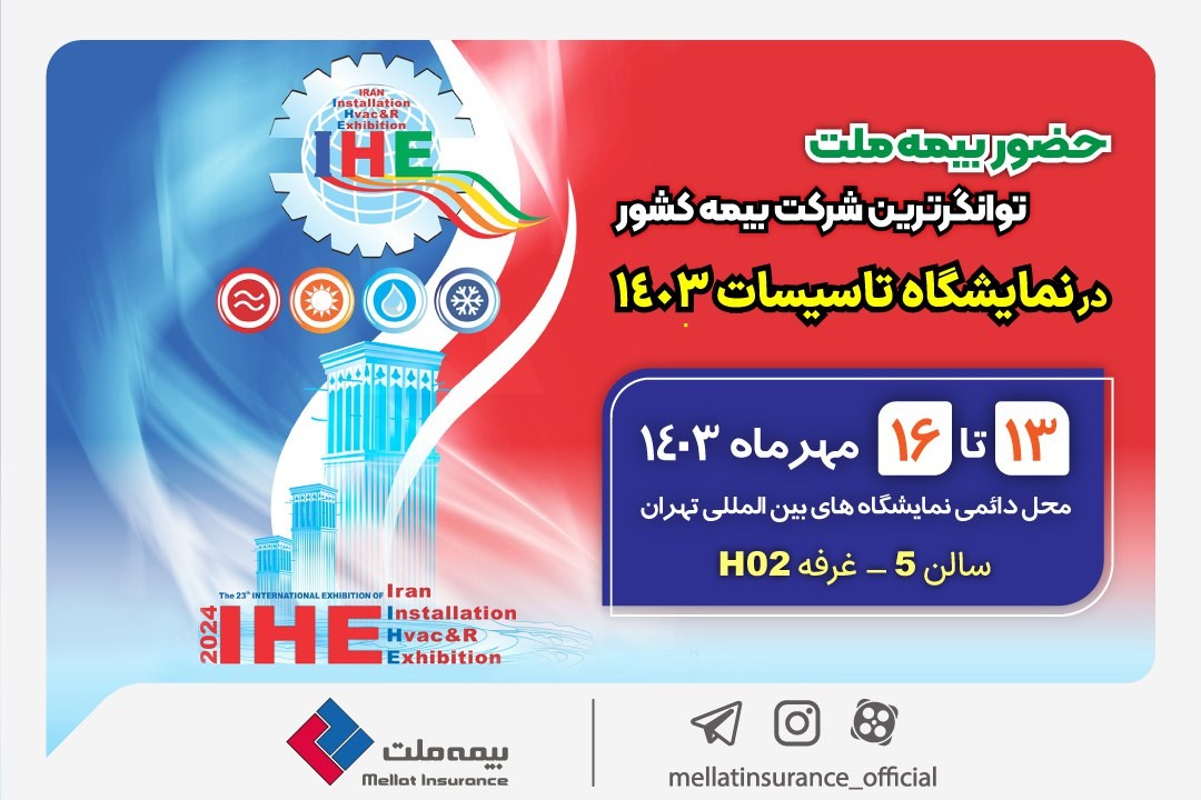 بیمه ملت، توانگرترین شرکت بیمه کشور در یست و سومین نمایشگاه بین المللی تاسیسات ساختمان، سیستم های سرمایشی و گرمایشی تهران سال ۱۴۰۳ حضور فعال دارد و با ارائه نوینترین خدمات بیمهای خود به فعالان این صنعت، آمادگی خود را برای پاسخگویی به نیازهای بیمهای این بخش از اقتصاد کشور اعلام میکند.
