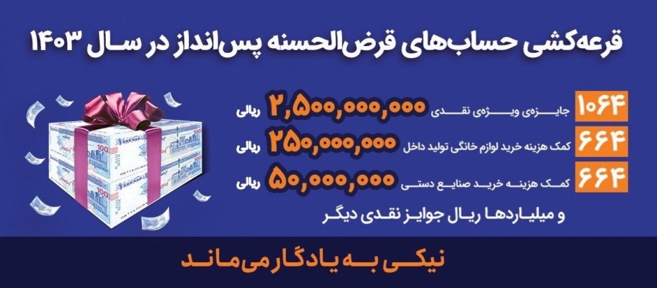 به گزارش روابط عمومی بانک رفاه کارگران، جوایز ارزنده این دوره از قرعهکشی حسابهای قرضالحسنه پسانداز به مناسبت شصتوچهارمین سالگرد تاسیس بانک رفاه کارگران در سال 1403، شامل 1.064 فقره جایزه ویژه نقدی هر یک به ارزش 2 میلیارد و 500 میلیون ریال، 664 فقره کمکهزینه خرید لوازم خانگی تولید داخل هر یک به ارزش 250 میلیون ریال، 664 فقره کمکهزینه خرید صنایع دستی هر یک به ارزش 50 میلیون ریال و 274.719 جایزه نقدی 2.500.000 ریالی است.