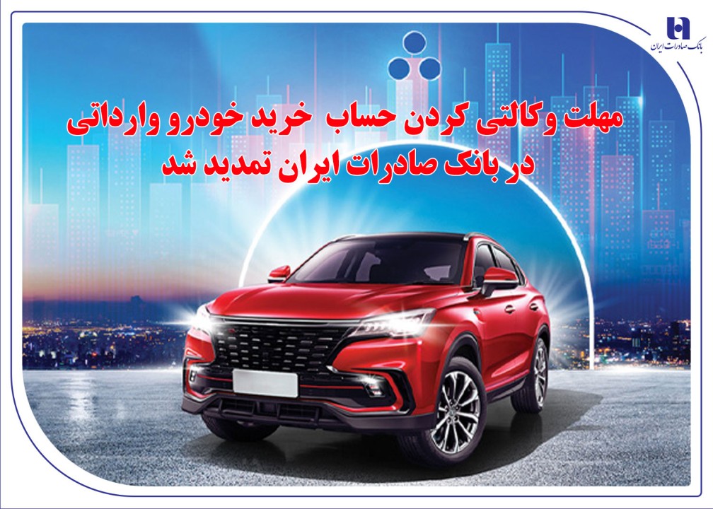 مهلت وکالتی کردن حساب در بانک صادرات ایران در طرح جدید عرضه عمومی خودروهای وارداتی تا روز شنبه ۵ آبان ماه تمدید شد.