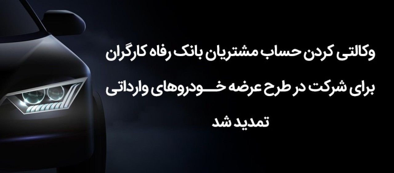 به دنبال تمدید مهلت شرکت در طرح عرضه خودروهای وارداتی، مشتریان بانک رفاه کارگران میتوانند نسبت به وکالتی کردن حسابهای خود به منظور شرکت در این طرح اقدام کنند.