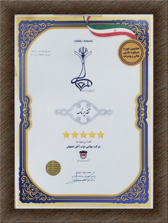 ذوب آهن اصفهان مفتخر به دریافت تقدیرنامه 5 ستاره جایزه ملی تعالی و پیشرفت