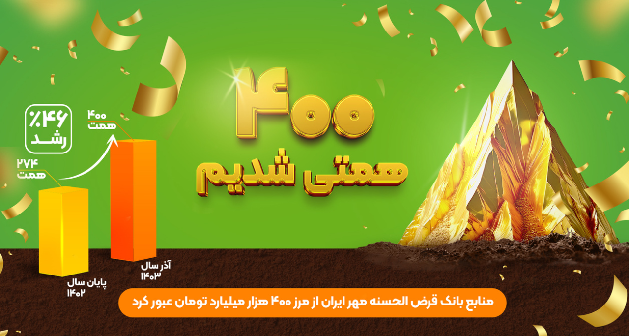 منابع بانک قرضالحسنه مهر ایران با ۴۶ درصد رشد در سال جاری به ۴۰۰ هزار میلیارد تومان بالغ شد.