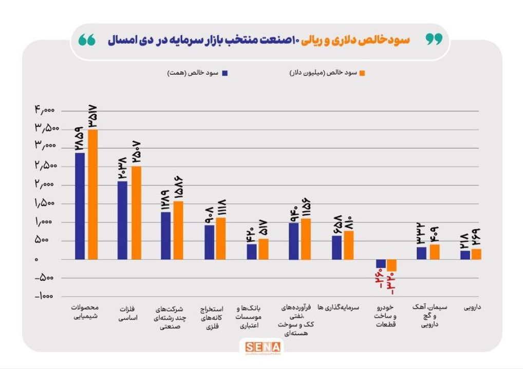 دادههای این گزارش نشان میدهد؛ در دی امسال صنایع «محصولات شیمیایی» 2،859 هزار میلیارد تومان، «فلزات اساسی» 2،038 هزار میلیارد تومان، «شرکتهای چند رشتهای صنعتی» 1،289هزار میلیارد تومان ، «استخراج کانههای فلزی» 908 هزار میلیارد تومان، «بانکها و موسسات اعتباری» 420 هزار میلیارد تومان، «فرآوردههای نفتی، کک و سوخت هستهای» 940 هزار میلیارد تومان، «سرمایه گذاری ها» 658 هزار میلیارد تومان، «سیمان ،آهک و گچ» 332 میلیارد تومان،«دارویی» 218 میلیارد تومان سودخالص شناسایی کرده و صنعت «خودرو و ساخت قطعات» 260 هزار میلیارد تومان زیان ساخته است.