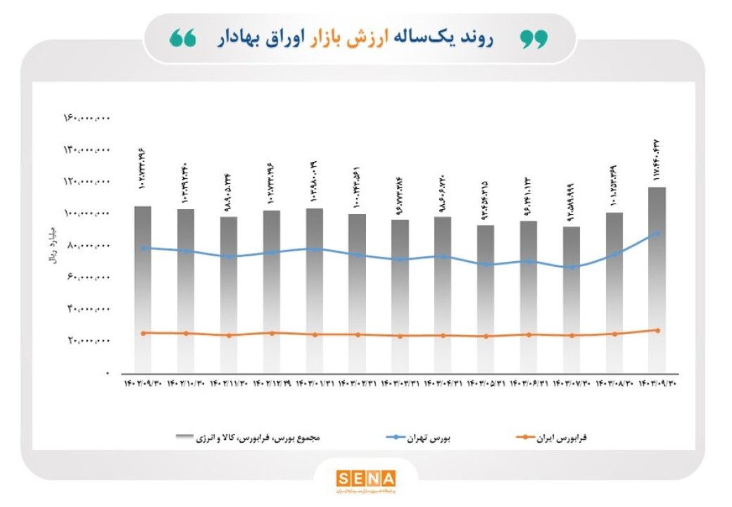 روند یک‌ساله ارزش بازار اوراق بهادار نشان می‌دهد؛ مجموع ارزش بازار اوراق بهادار شامل «بورس تهران، فرابورس، بورس انرژی و بورس کالا»، در آذر ماه امسال به ۱۱۷،۴۴۰ میلیارد ریال رسید.