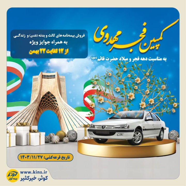 همزمان با دهه فجر انقلاب اسلامی و میلاد با سعادت حضرت قائم(عج) این شرکت در کمپین فجر مهدوی به مشتریان گرامی در صورت خرید بیمهنامه در رشتههای ثالث و بدنه، عمر و سرمایهگذاری از طریق باشگاه مشتریان به قید قرعه جوایز نفیسی اهدا خواهد کرد.