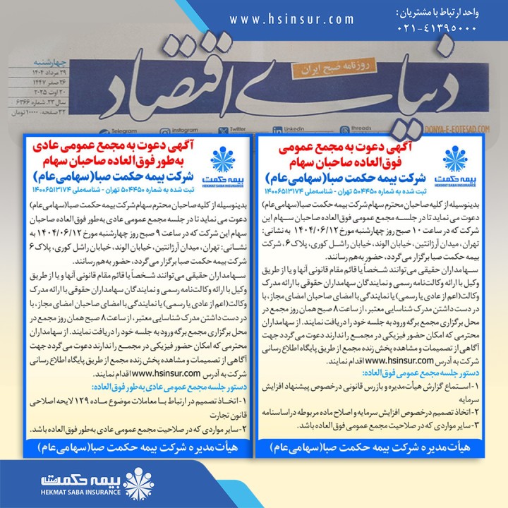 شرکت بیمه حکمت صبا دو مجمع عمومی عادی به‌طور فوق‌العاده و عمومی فوق العاده برگزار خواهد کرد.